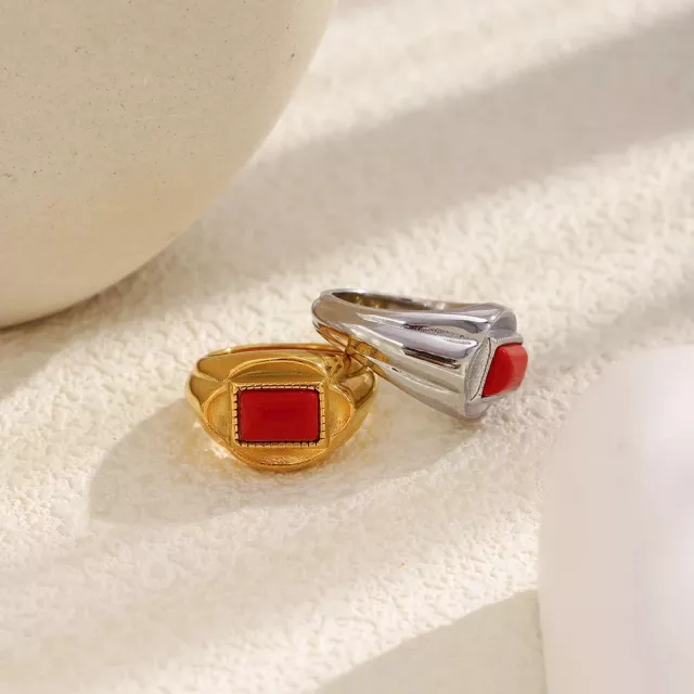 Elevate your style with this stunning geometric red gemstone stainless steel ring. The perfect fusion of bold design and luxury, this ring is a must-have accessory for every modern woman. Featuring a striking red gemstone set in a tension setting on a base of premium 316L stainless steel, it’s plated with rich 18K gold for a sophisticated finish. Whether you’re heading to the office or attending a party, this piece will add a touch of class to any outfit.