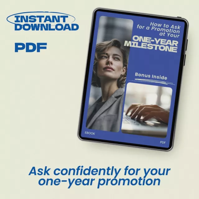 If you’ve hit your one-year mark and feel ready for more, but aren’t sure how to ask for a promotion at a one year mark, this powerful eBook is your step-by-step roadmap. Designed to remove the guesswork, this guide walks you through exactly what to say, when to say it, and how to position yourself as the obvious choice for advancement. Whether you’re feeling overlooked or simply ready to grow, this resource gives you the clarity and confidence to advocate for yourself professionally and effectively.